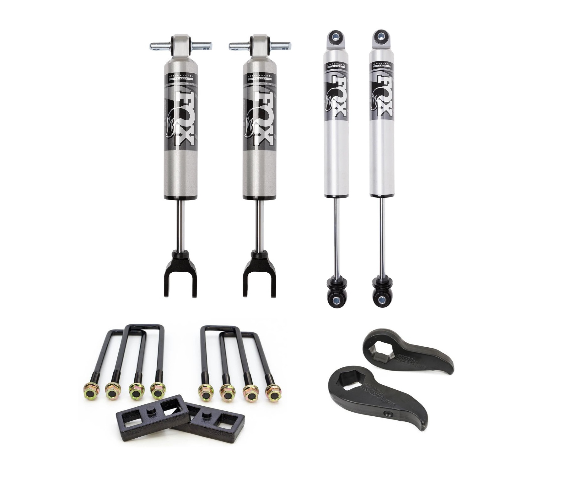 This kit includes FOX 2.5 Performance Shocks, ReadyLift Torsion Key Kit and Rear Lift Block Kit.
