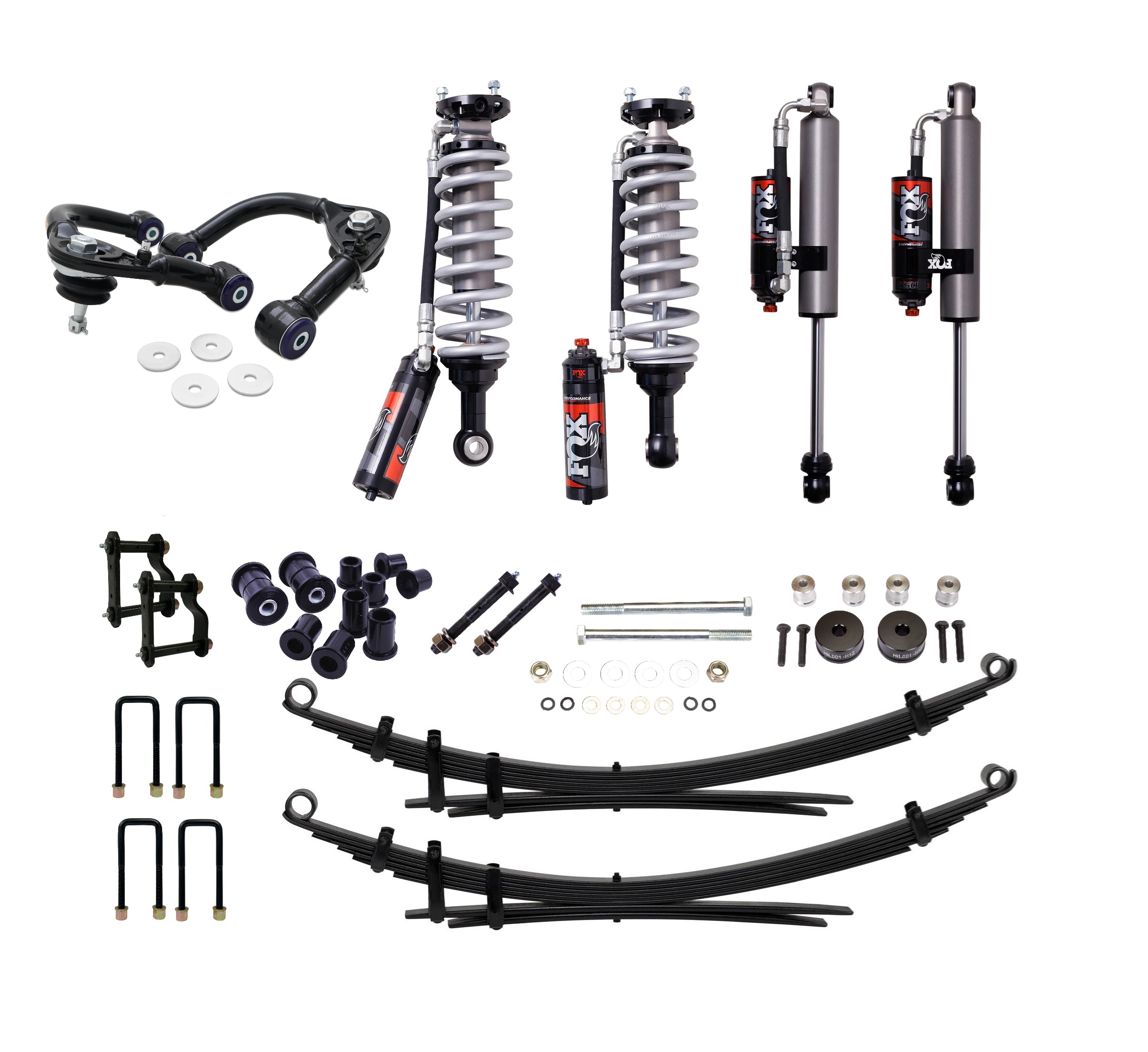 This kit includes FOX 2.5 Performance Elite Remote Reservoir Shocks, Heavy Duty Leaf Springs and all required fitting components.