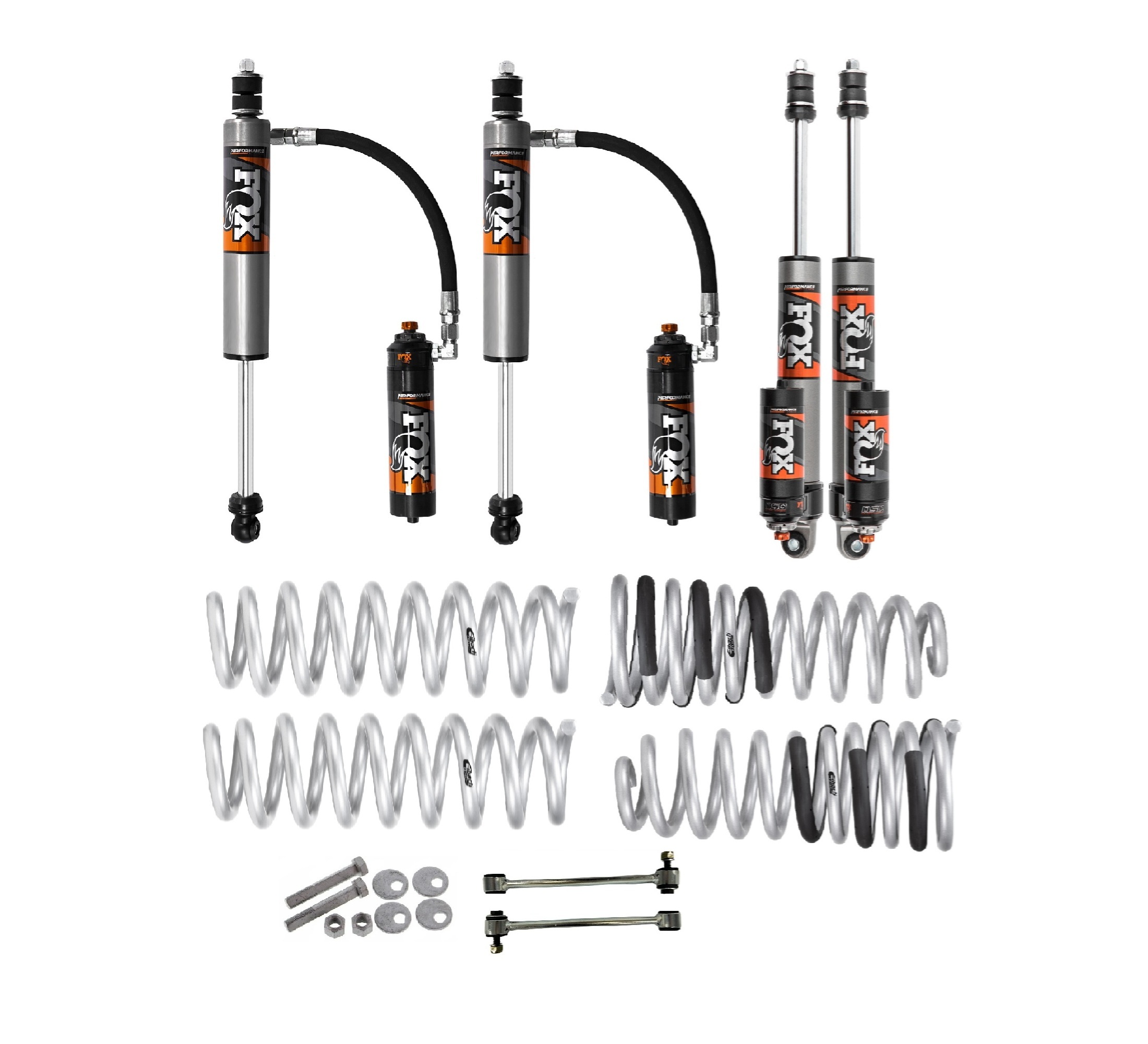 This kit includes FOX 2.5 Performance Elite Remote Reservoir Shocks, Eibach Raised Coil Springs, Sway Bar Links and Castor Correction Bolts.