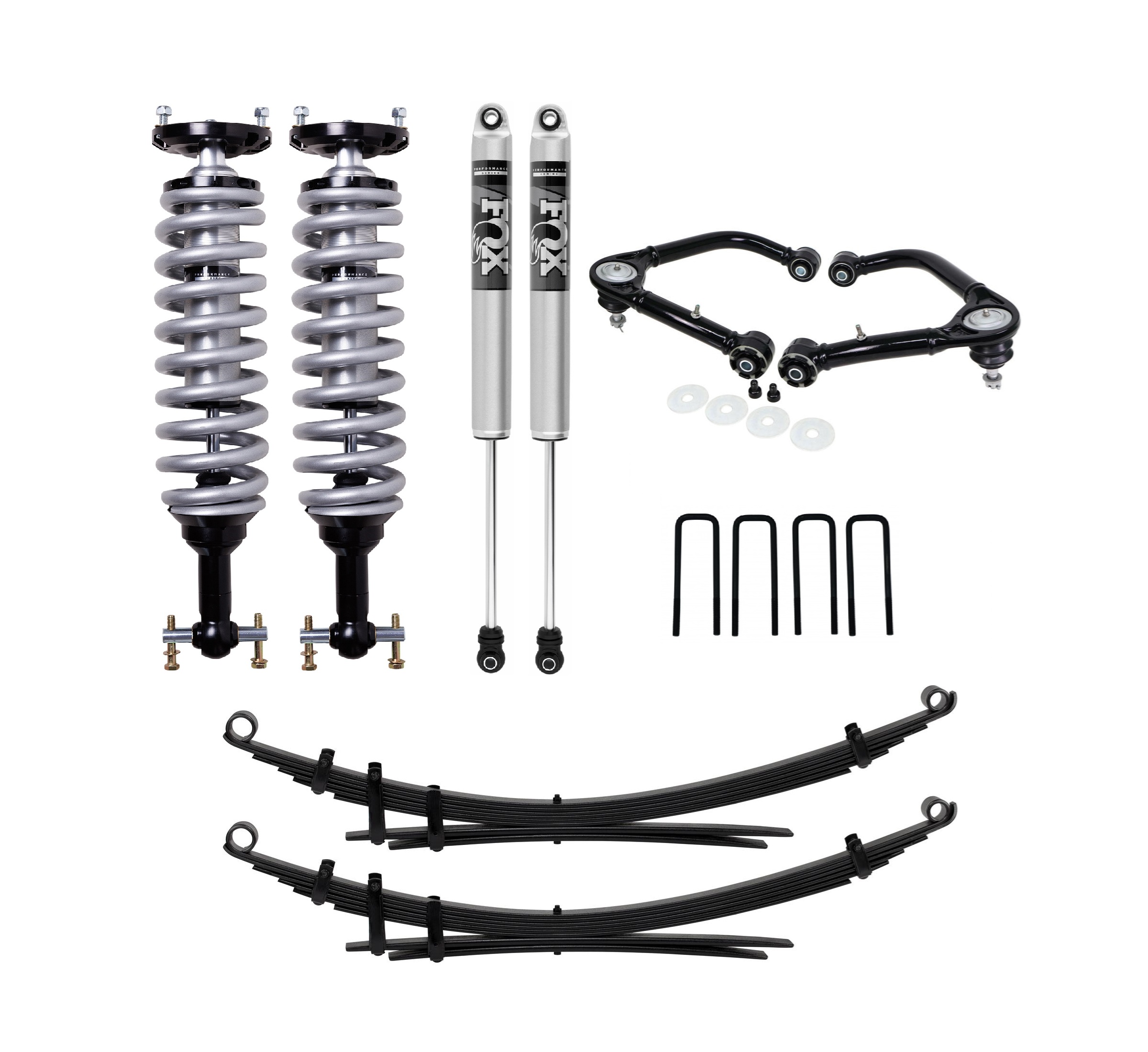 This kit includes FOX 2.5 Performance Shocks, Whiteline Upper Control Arms, Heavy Duty Rear Leaf Spring and U-bolts.
