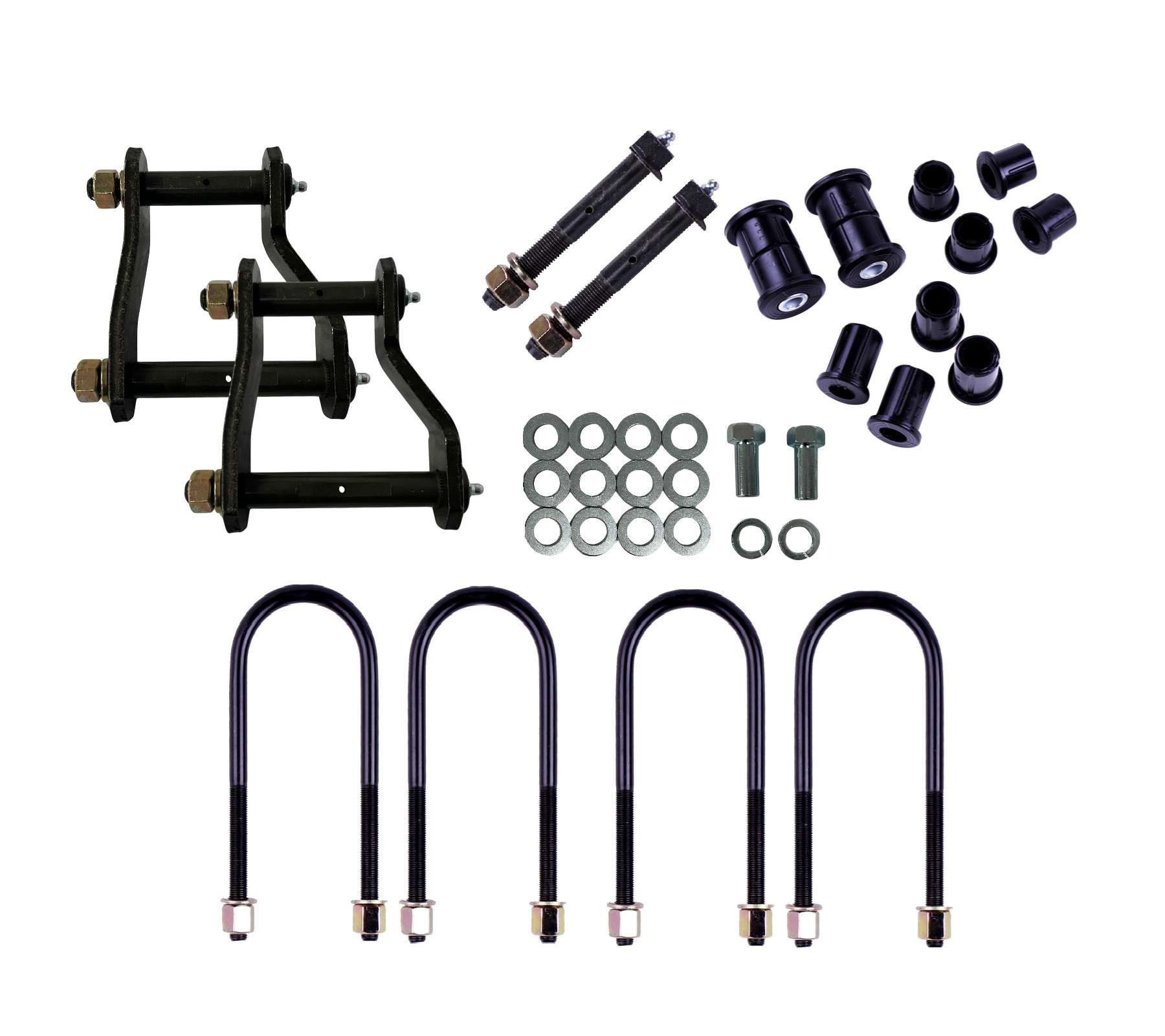 Includes U-Bolts, Greasable Pins, Greasable Shackles, Rear Leaf Spring Bush Kit and Transmission Spacer.