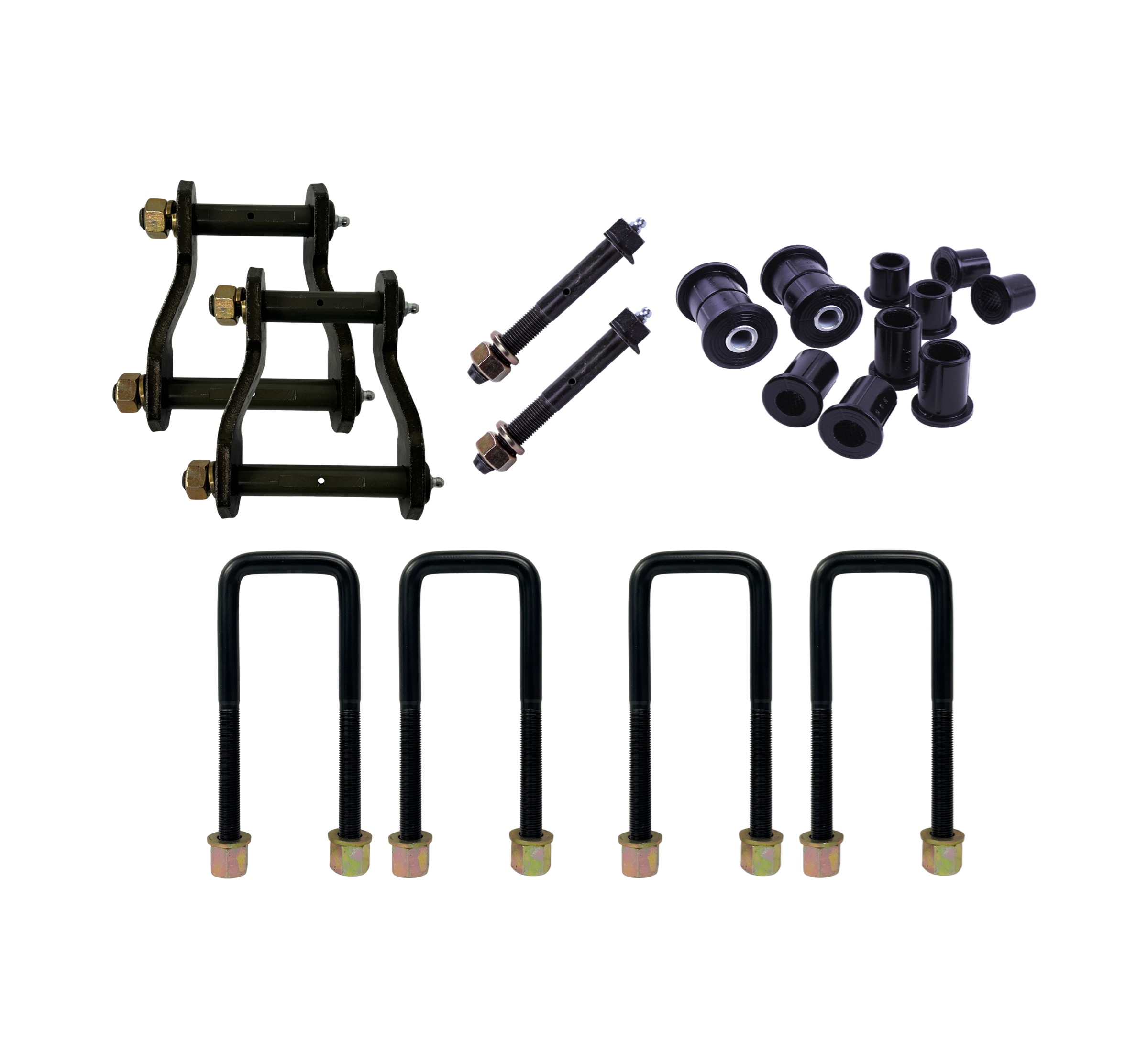 Includes U-Bolts, Greasable Pins, Greasable Shackles and Rear Leaf Spring Bush Kit.