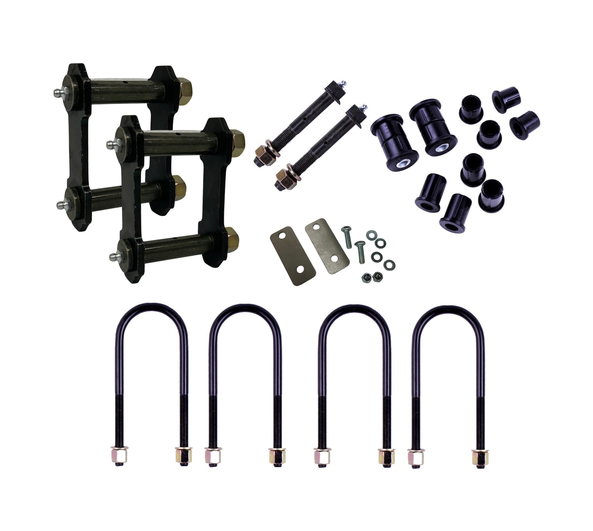Includes U-Bolts, Greasable Pins, Greasable Shackles and Rear Leaf Spring Bush Kit.