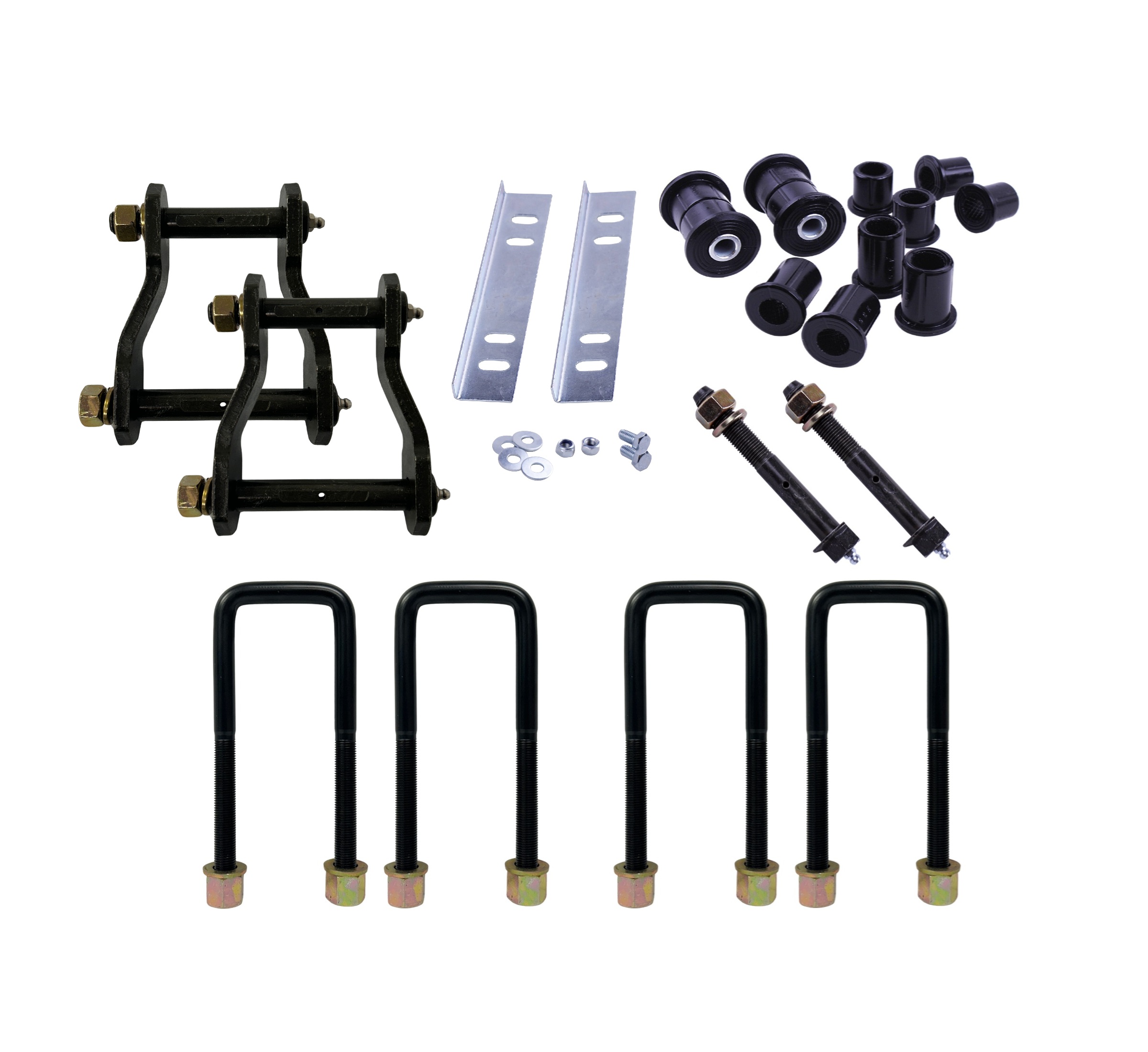 Includes U-Bolts, Greasable Pins, Greasable Shackles, Rear Leaf Spring Bush Kit and Handbrake Relocation Bracket.