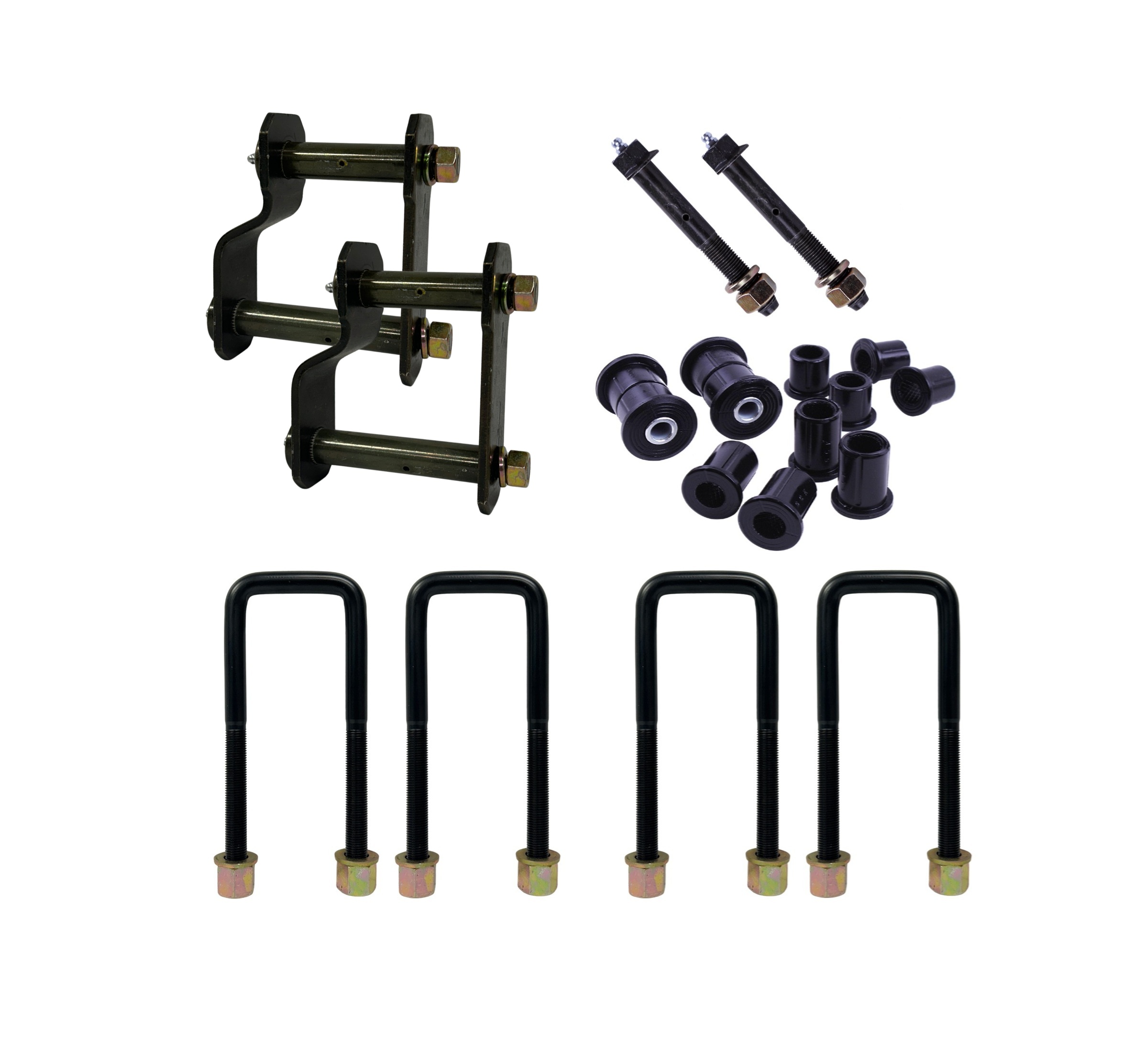 Includes U-Bolts, Greasable Shackles, Greaseable Pins and Rear Leaf Spring Bush Kit.