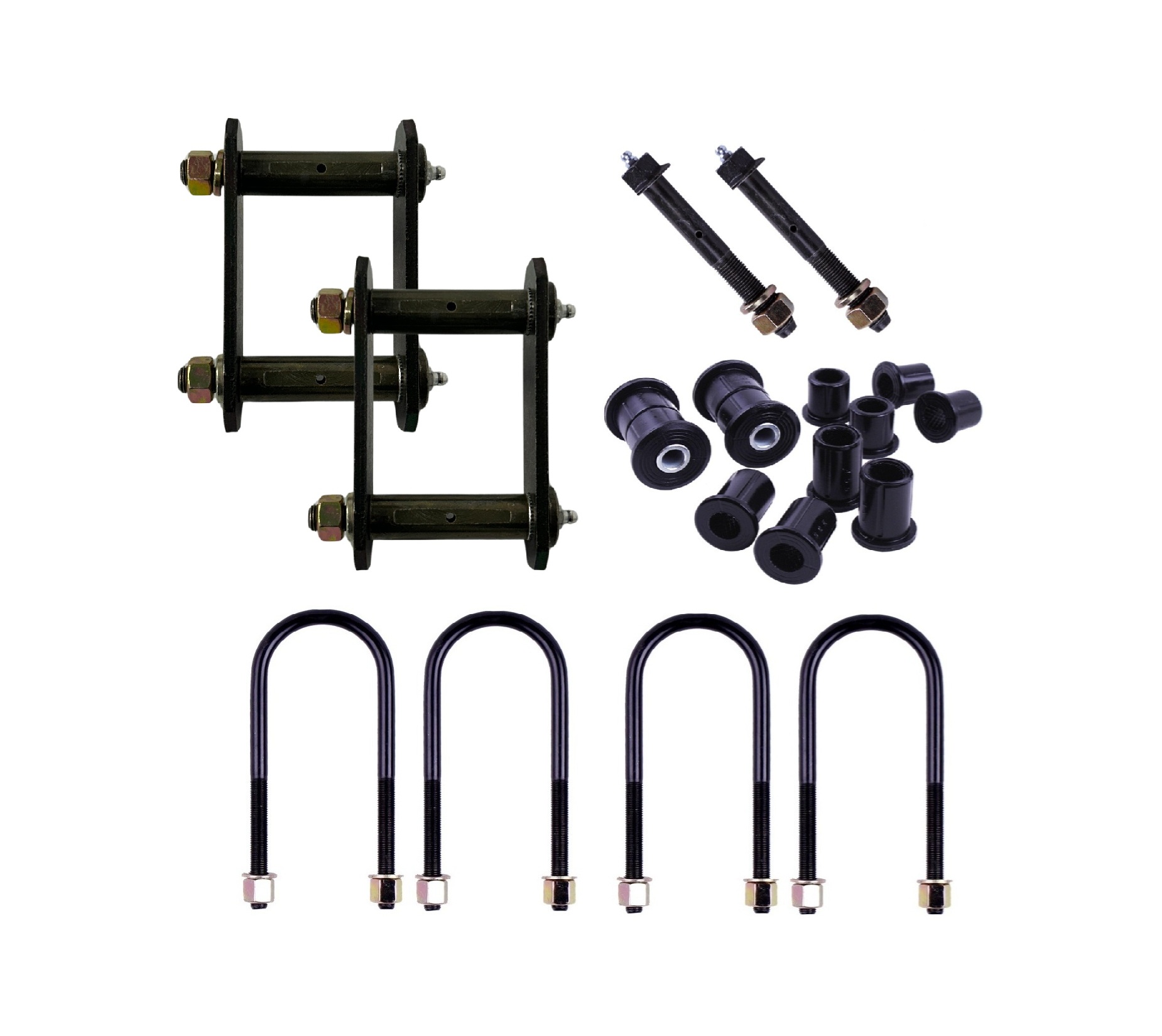 Includes U-Bolts, Greasable Shackles, Greasable Pins and Rear Leaf Spring Bush Kit.
