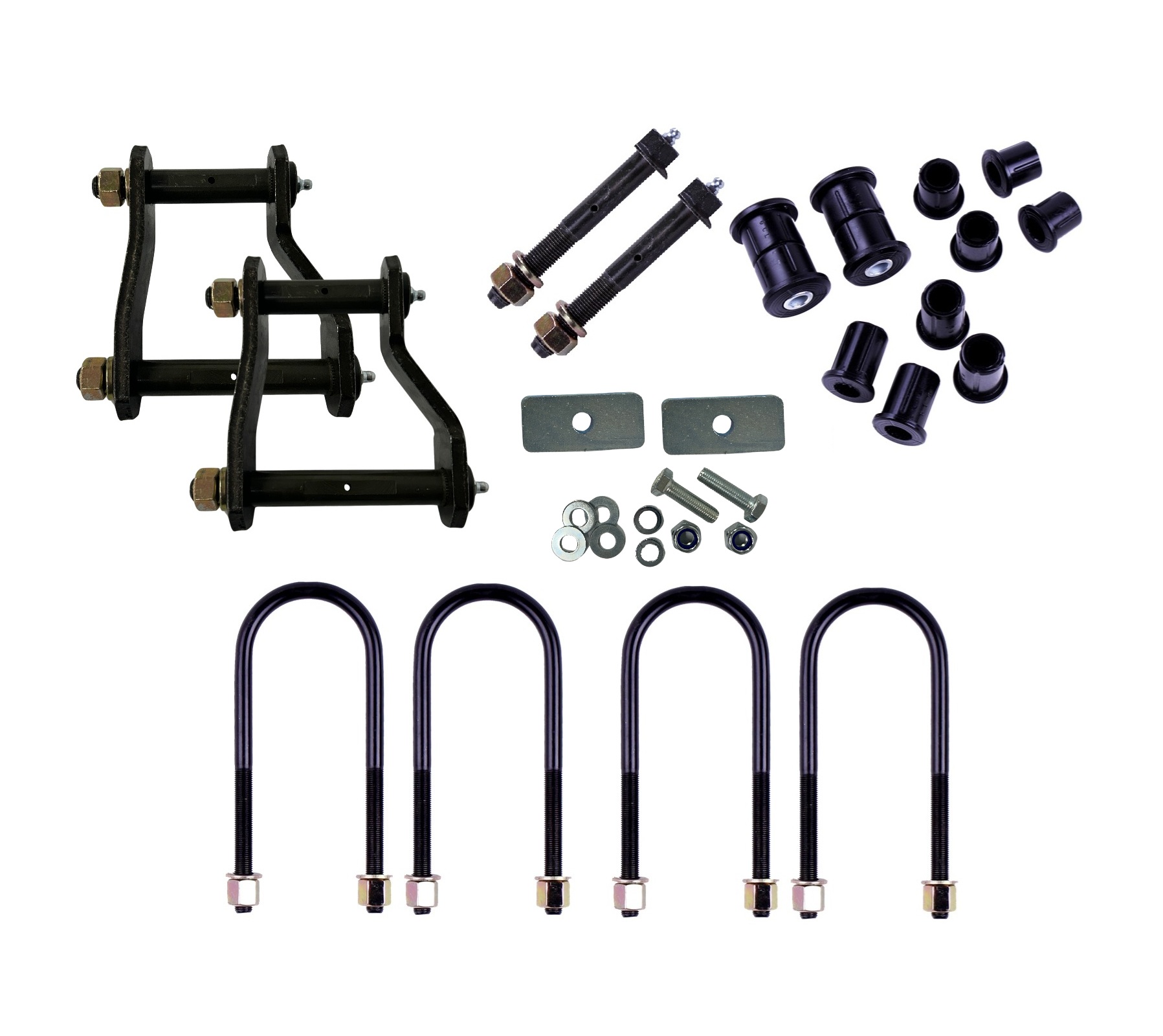 Includes U-Bolts, Greasable Pins, Greasable Shackles, Rear Leaf Spring Bush Kit and Centre Bearing Kit.